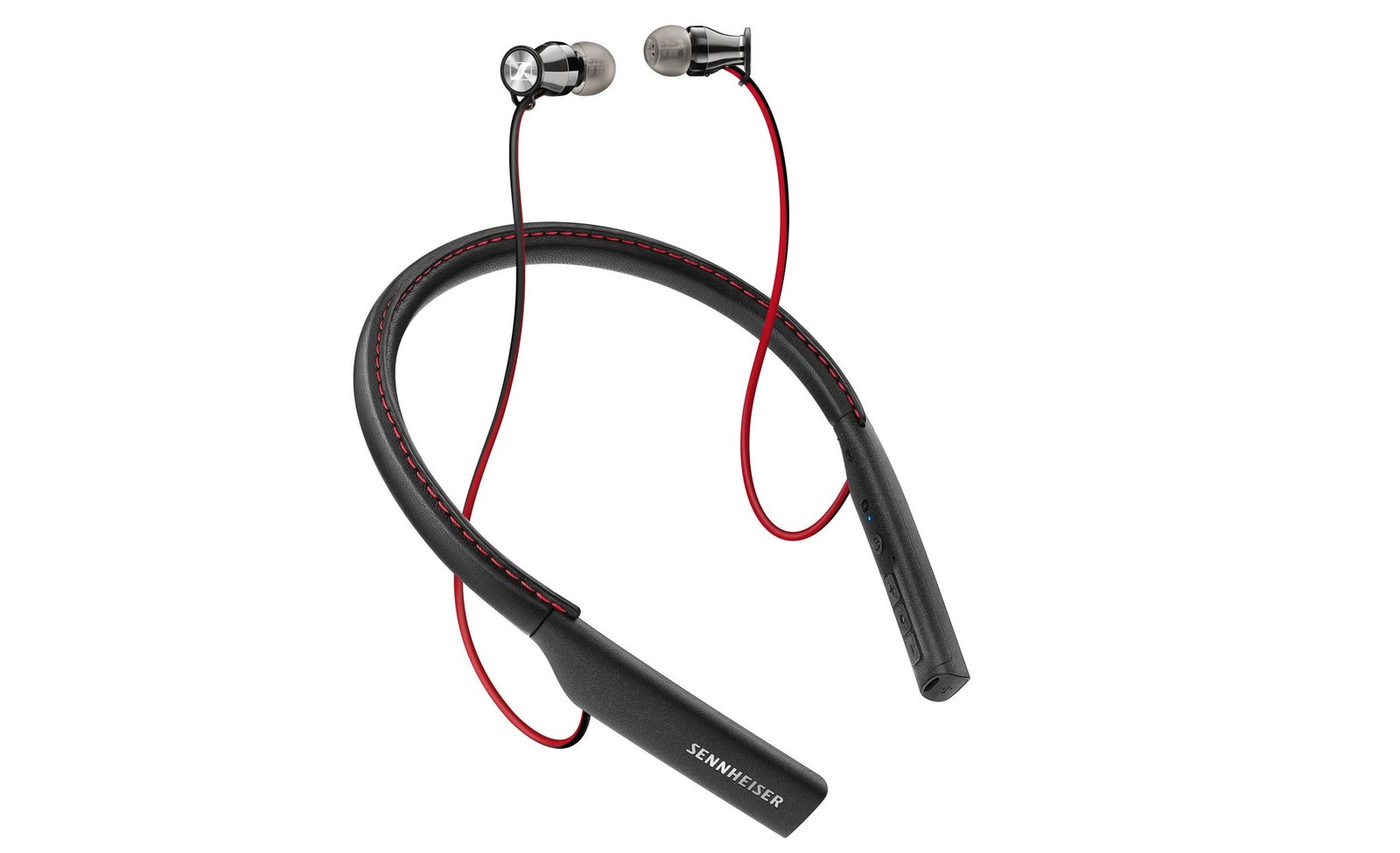 O Momentum In-Ear Wireless tem design ergonômico com neckband, suporte para apoiar em volta do pescoço e dar mais firmeza durante o uso do fone. Feito de couro e com acabamento cromado espelhado nos fones, as peças pretas com detalhes em vermelho prometem ser resistentes a impactos. O modelo traz também um case rígido para o transporte do equipamento.